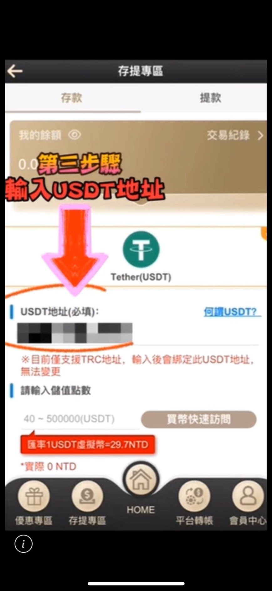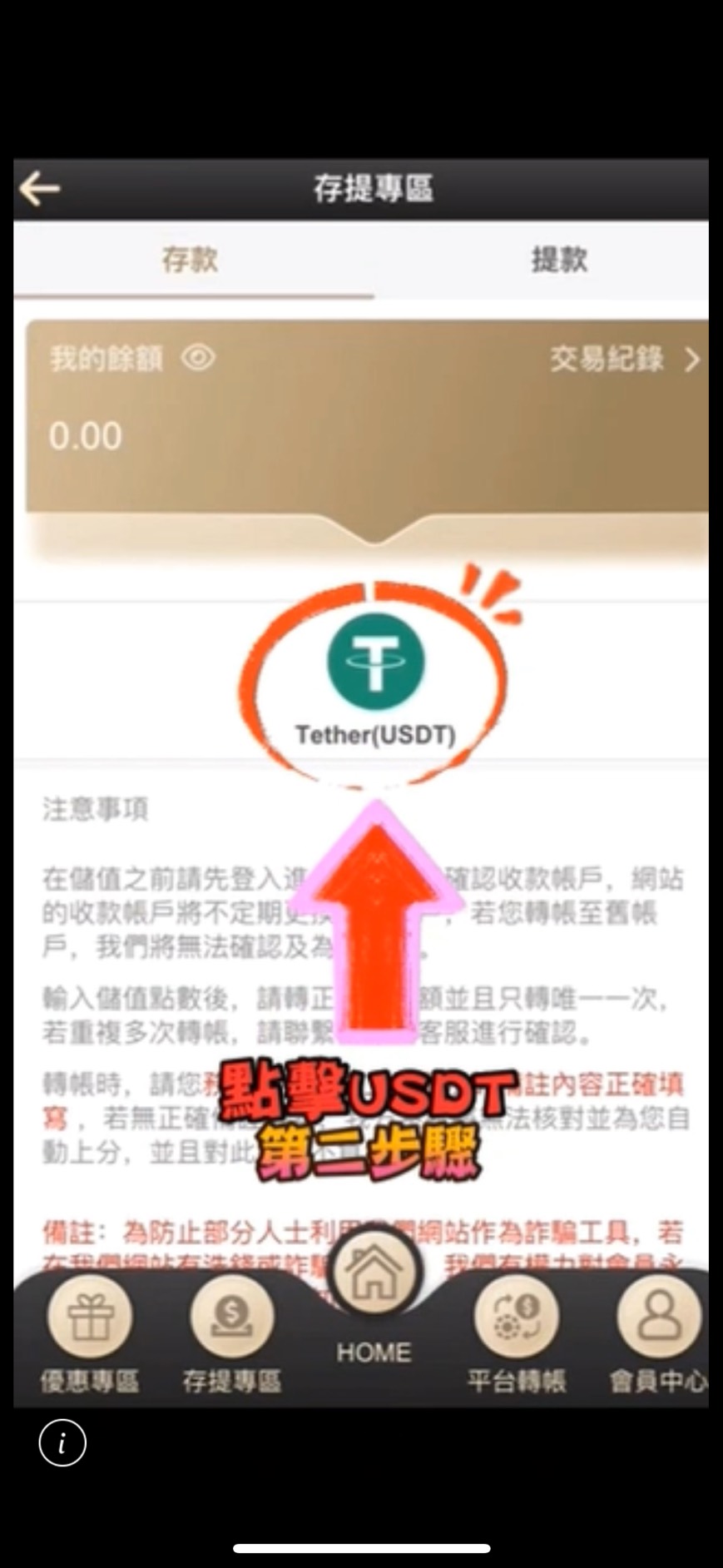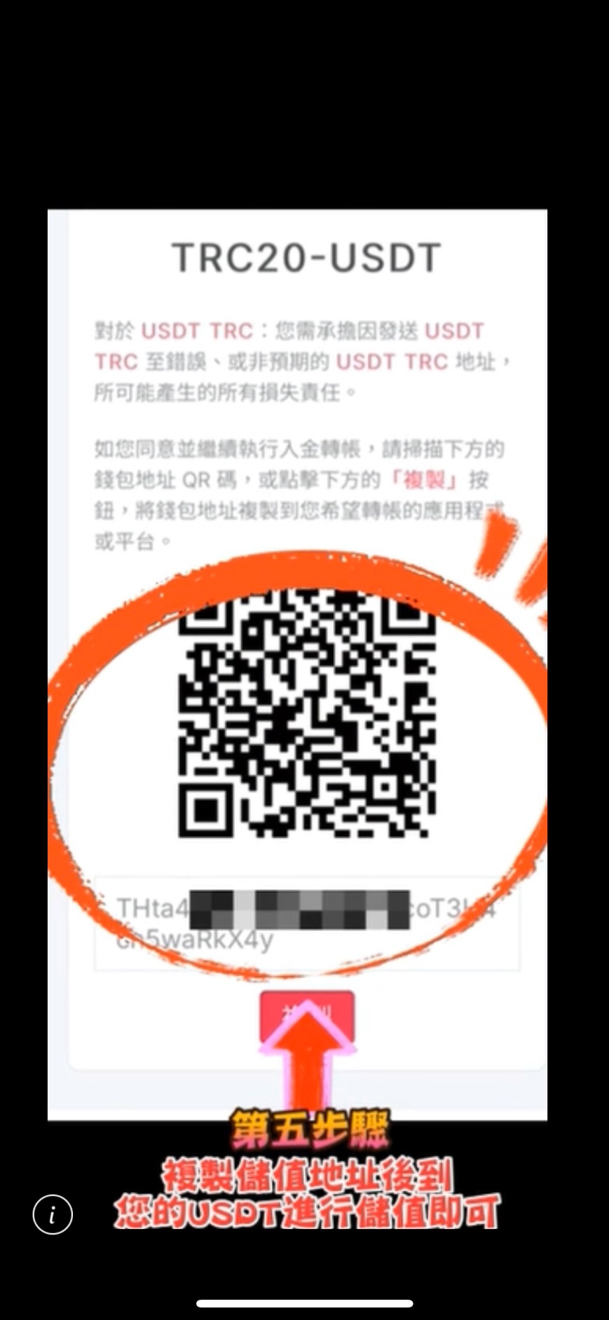 ➏ 購買完成USDT後,請於平台USDT存款渠道進行列單,複製產生的TRC20-USDT地址或者儲存二維碼